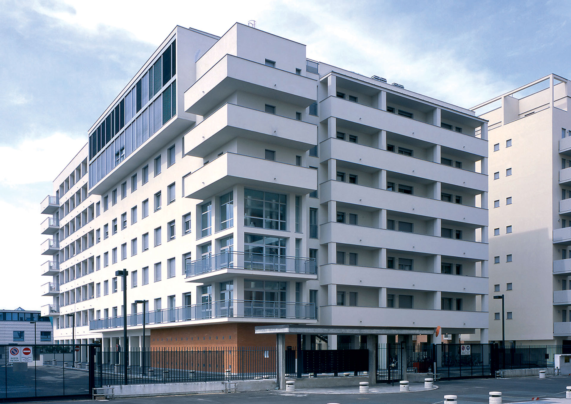 The new residence for the university is located about 1.300 m away form the headquarters of the Politecnico of Milan, located in Piazza Leonardo da Vinci. The building consists in two main twin-blocks facing each other based on a C structure. The building forms an open C facing east and rises eight story from the ground, developing an area of approximately 6.942 sq m. A central “hallway” distributes the living accommodation on the East and West side, which is out of alignment with the building’s façade.